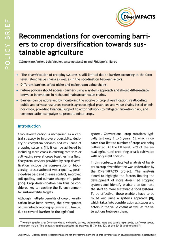 - Barriers can be addressed by monitoring the uptake of crop diversification, reallocating public and private resources towards agroecological practices and value chains based on mi-nor crops, providing financial support to actor networks to mitigate innovation risks, and communication campaigns to promote minor crops.