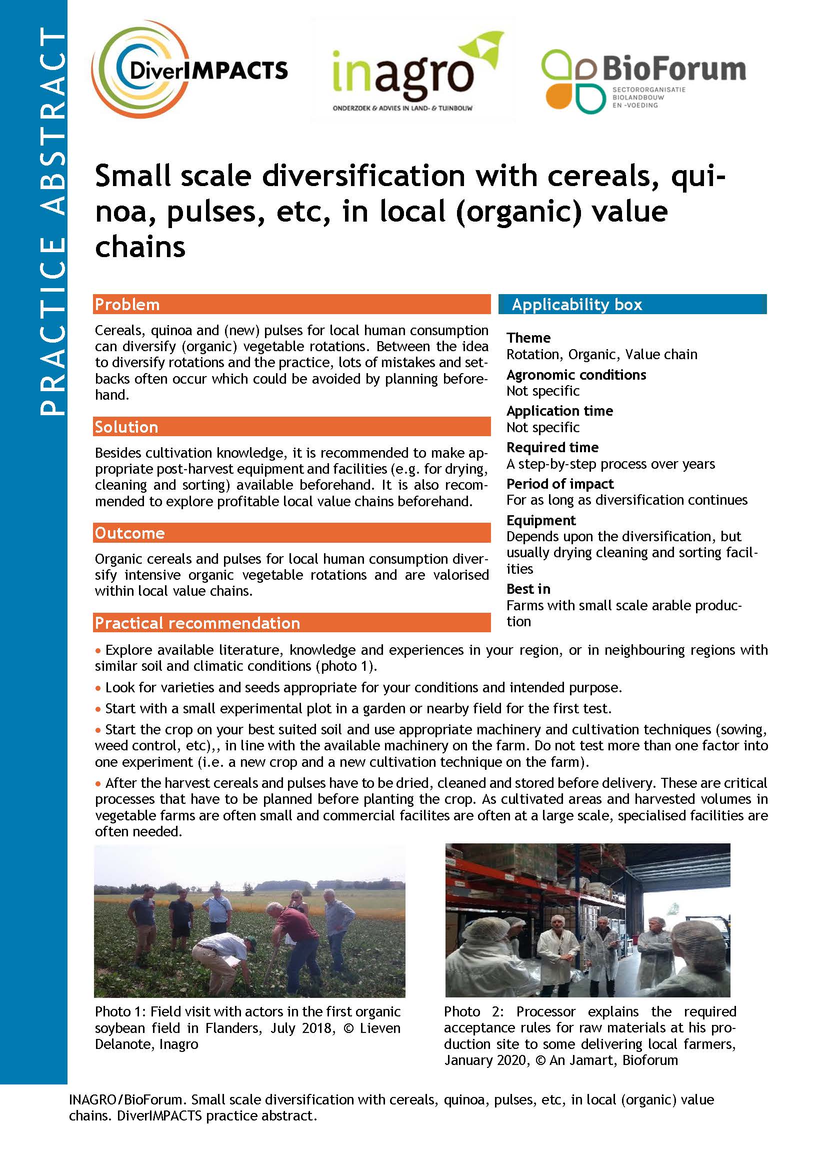 Problem: Cereals, quinoa and (new) pulses for local human consumption can diversify (organic) vegetable rotations. Between the idea to diversify rotations and the practice, lots of mistakes and setbacks often occur which could be avoided by planning beforehand.