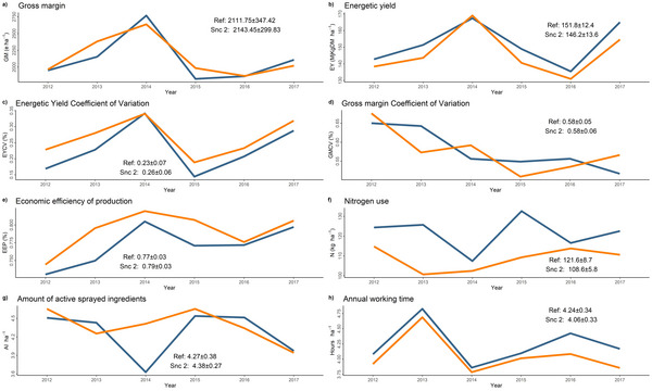 The introduction of legumes had a slightly negative effect on energy productivity (3.7%, Fig.2b), and its overall variation increased by 15.4% (Fig.2c). At the environmental level, the crop-livestock linkage led to a marginal (2.6%) increase in pesticide application (0.1 active ingredients per hectare, Fig.4g) and, as expected, caused a reduction in nitrogen applications by 13.0 nitrogen units per hectare (10.7%; Fig.4f).