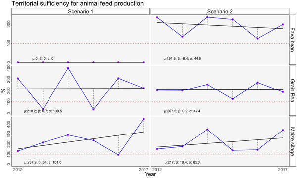 Our results suggest that only scenario 2, based on a synergistic collaboration, allows livestock and arable farmers to achieve their objectives while improving sustainability. This strategy implied an annual conversion of 3.2 ± 4.0% (i.e., 11.2 ± 14.0 hectares) of the arable farmers’ utilised agricultural area to legumes, including specific spatial land-use coordination. On average, the arable farmers involved in the case study produced 196.9 ± 57.9 ton year-1 of fava beans and 119.4 ± 29.9 ton year-1 of peas, respectively. This completely satisfied the respective annual feed needs of the two livestock farmers (Fig.1).