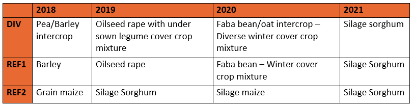 The trial has four replications in a randomized block design with plots of the size 15x30 m (Figure 1). The three treatments are a Reference organic rotation (REF1), a diversified organic rotation with intercropping (DIV) and a maize/sorghum rotation (REF2). The crop rotation is shown in Table 1.
